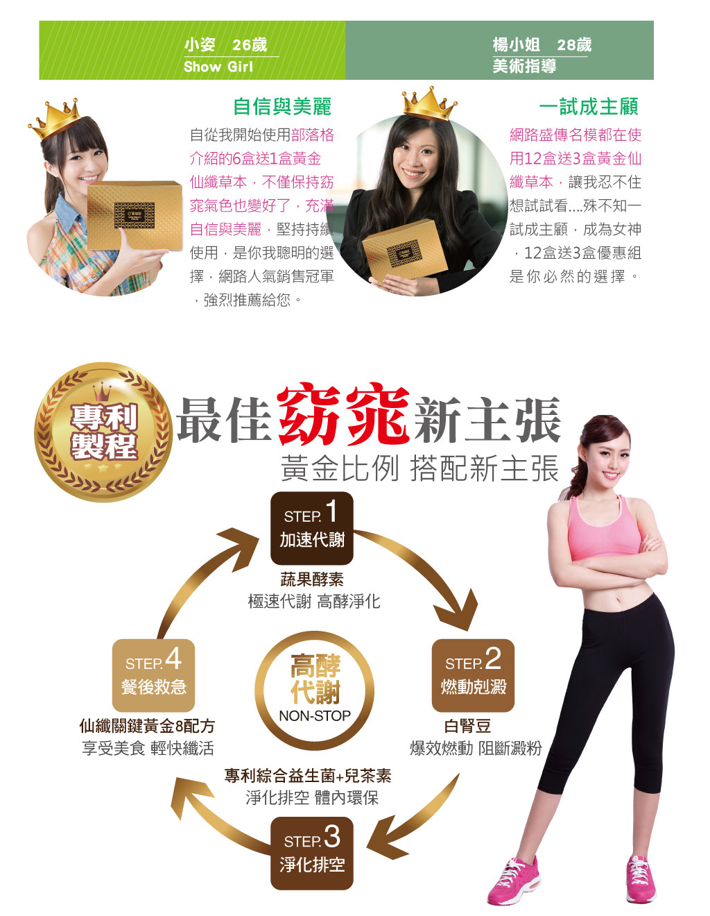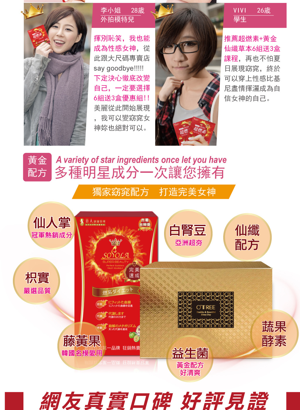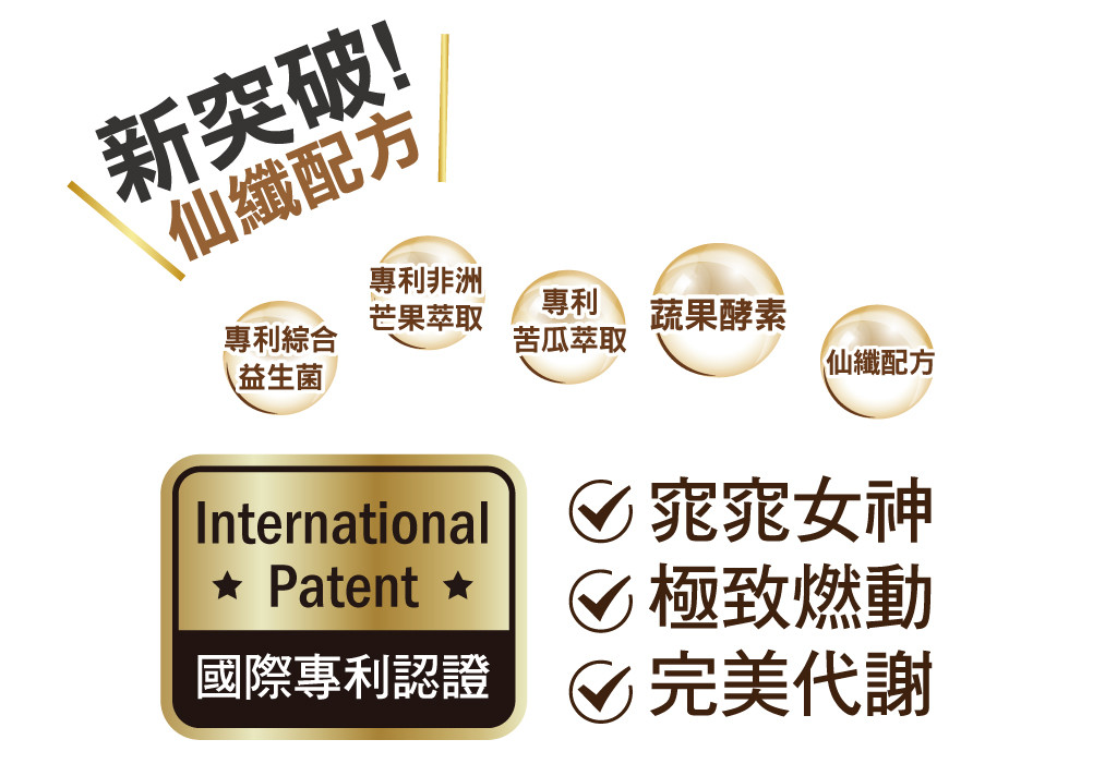 成 分:綜合蔬果酵素粉、專利綜合益生菌、綠茶萃取物、白腎豆萃取物、磷酸鈣、綜合蔬果抽出物、專利松樹皮萃取物、專利複合甘胺酸鋅、苦瓜萃取物(含專利胜肽)、神仙菜萃取物、專利非洲芒果種子萃取物、綠咖啡萃取物、苦橙萃取物、薑黃萃取粉、黑胡椒萃取物、啤酒酵母B群、海水抽出物(含鎂)。