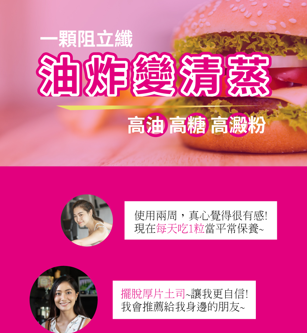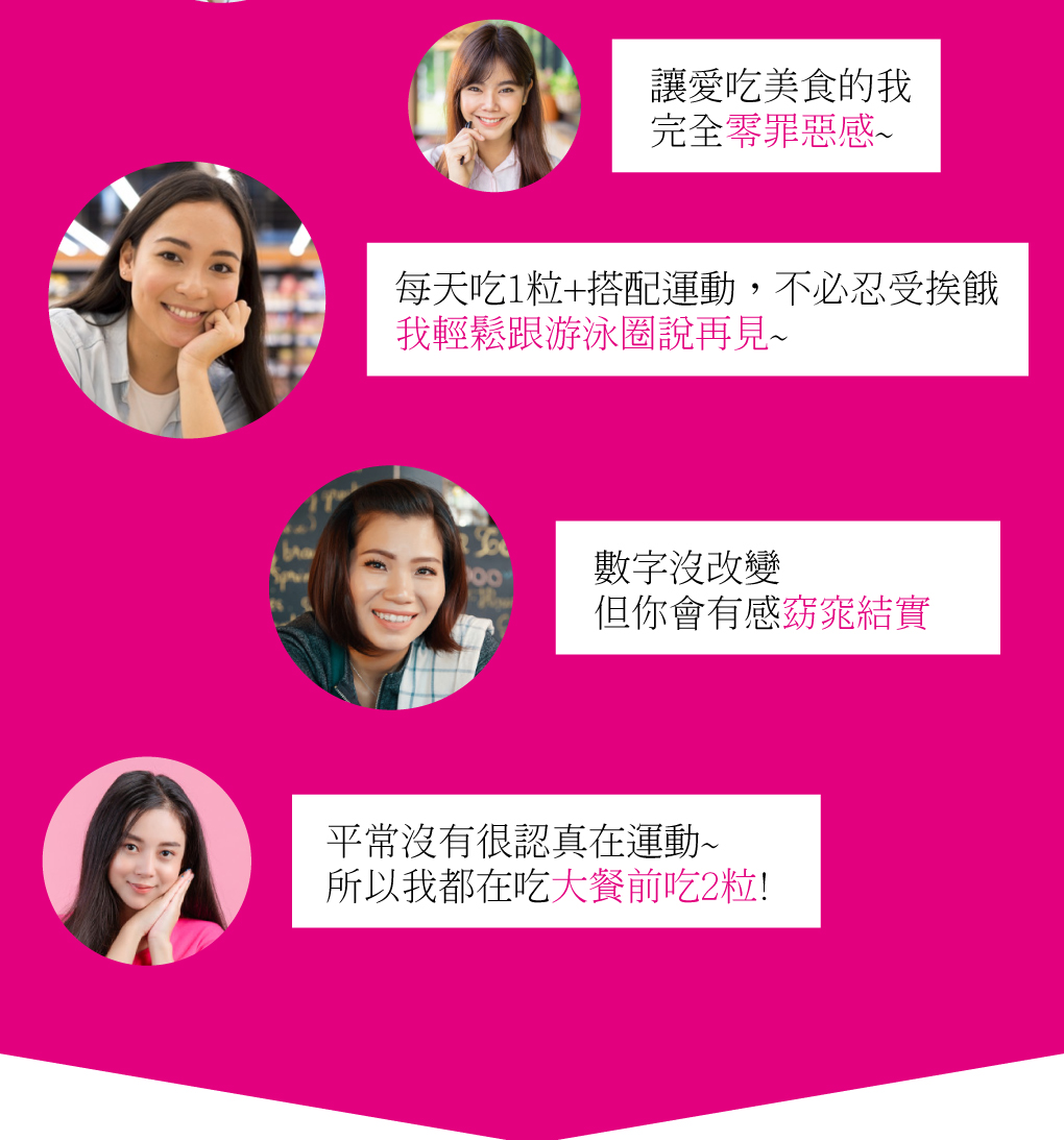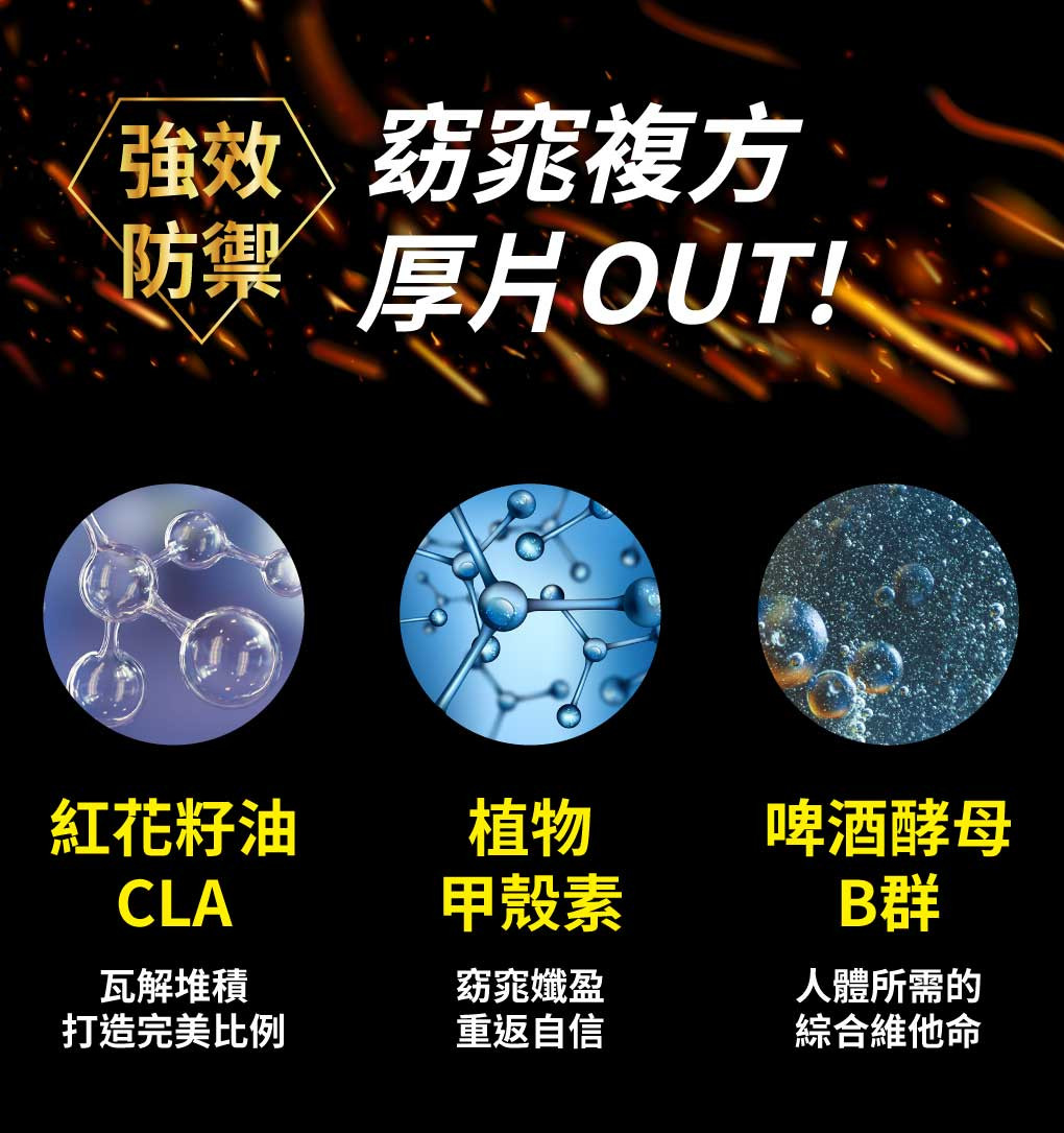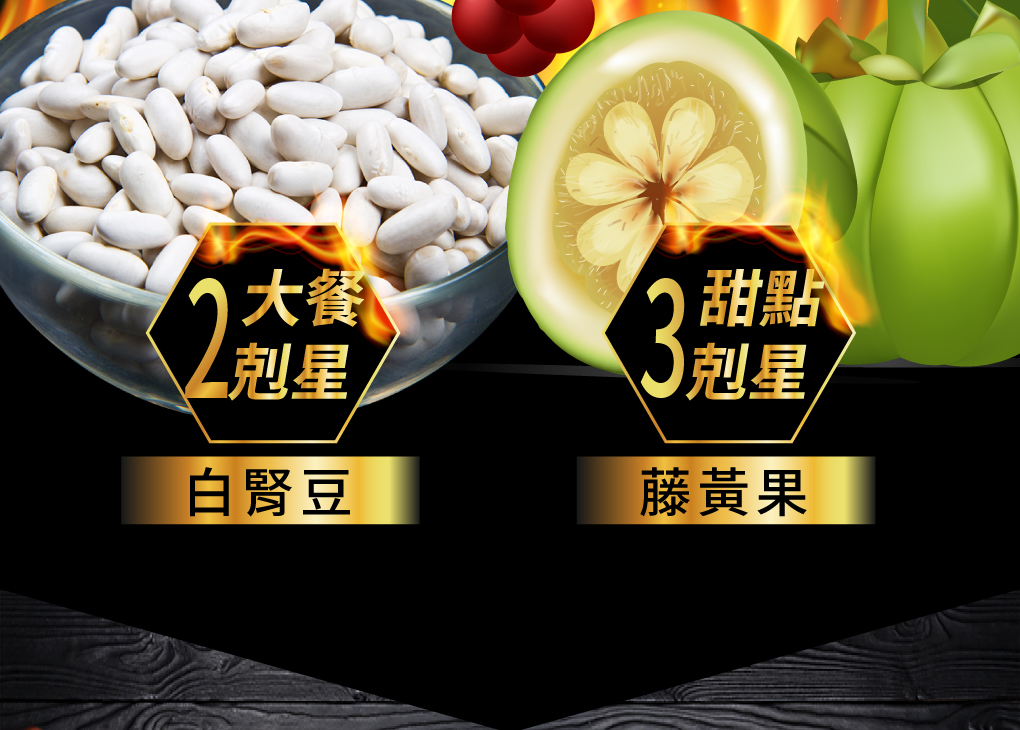 成 分:白腎豆抽出物、藤黃果萃取物、紅花籽萃取物(含CLA共軛亞麻油酸) 、仙人掌、武靴葉、植物甲殼素(菇蕈來源) 、啤酒酵母(含B群) 、番紅花萃取物