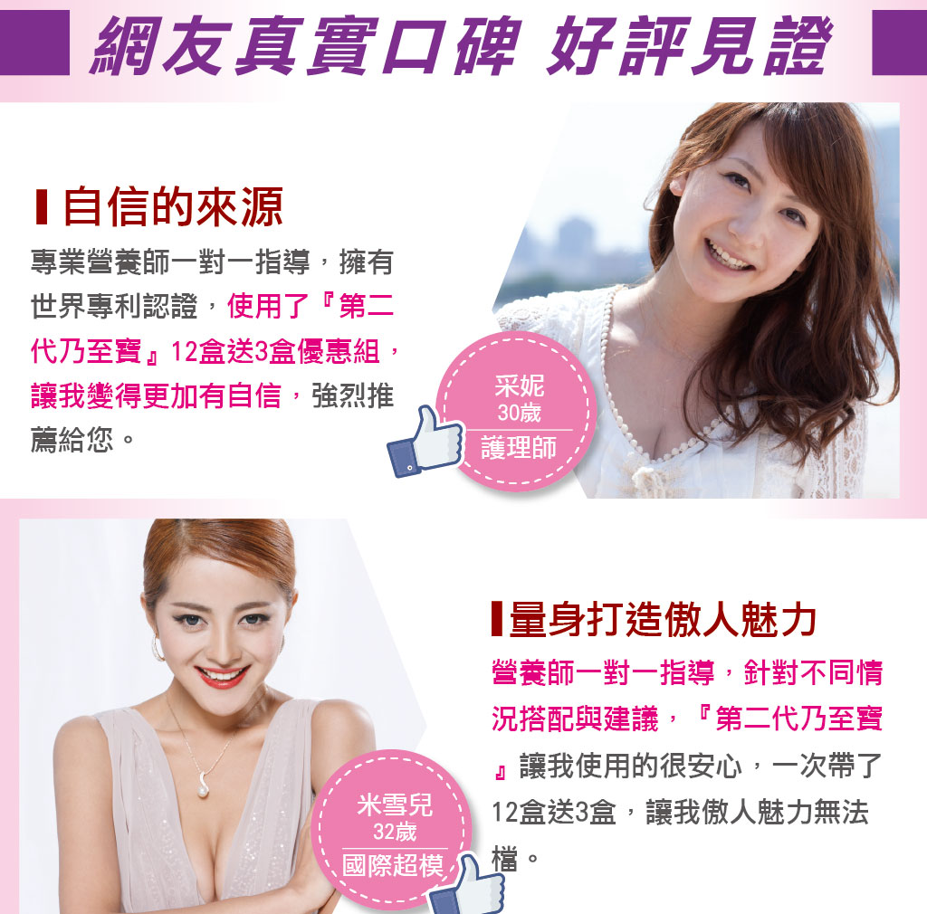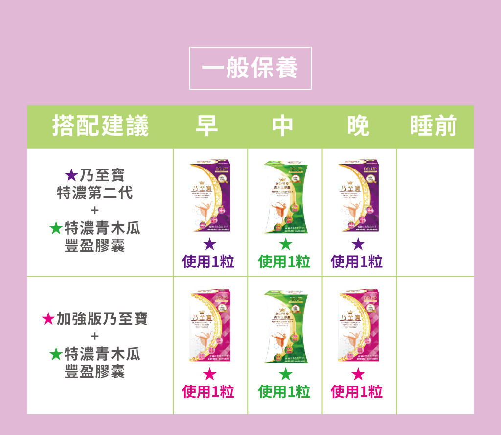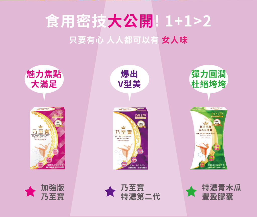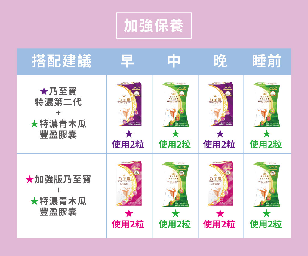 ‧乃至寶使用期間建議搭配【特濃青木瓜豐盈膠囊】、【鑽透膠原蛋白美顏粉】或【活力美胸霜按摩使用】,使目標更快速達成。
