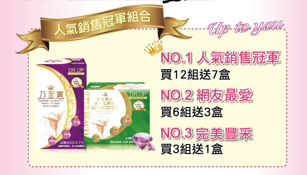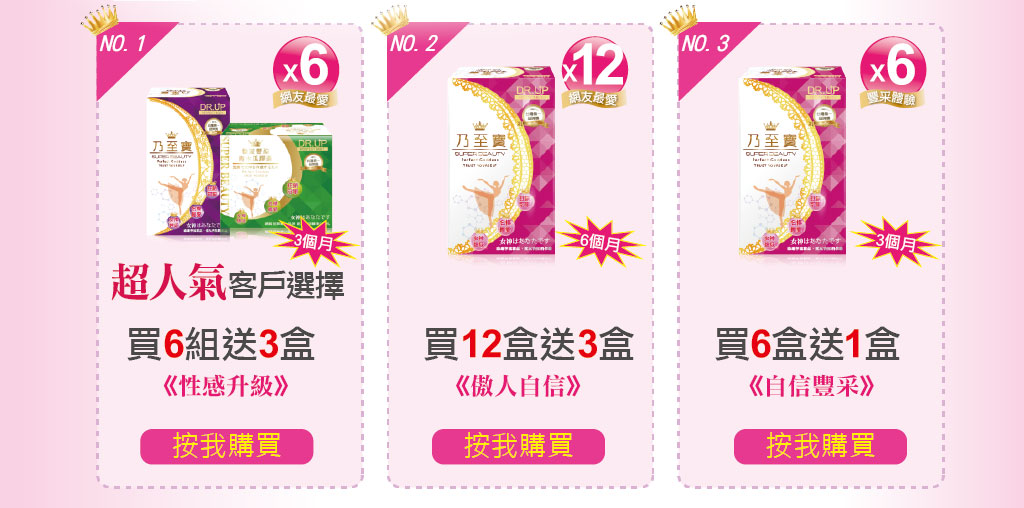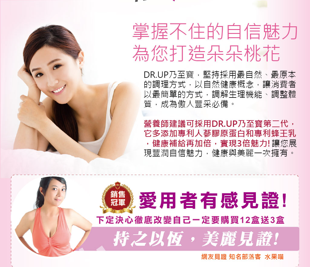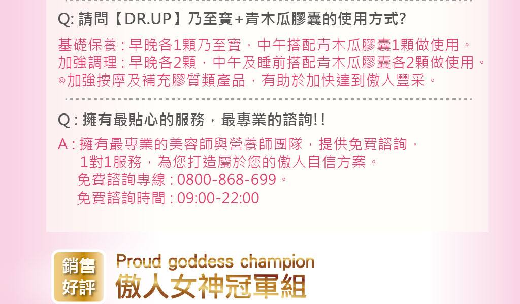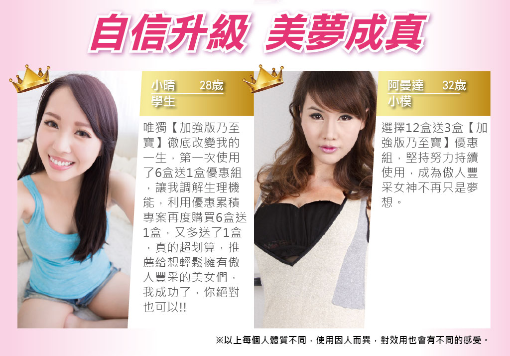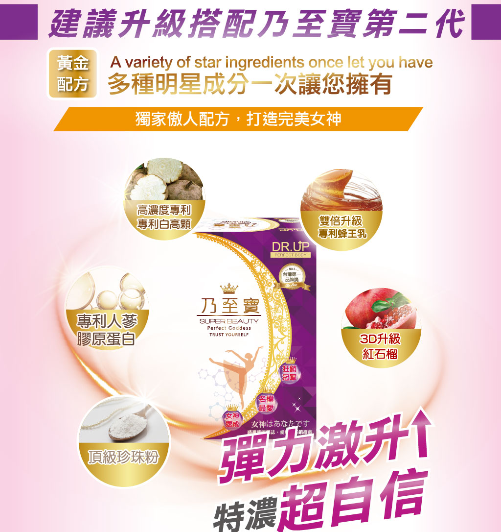 ‧乃至寶使用期間建議搭配【特濃青木瓜豐盈膠囊】、【鑽透膠原蛋白美顏粉】或【活力美胸霜按摩使用】,使目標更快速達成。