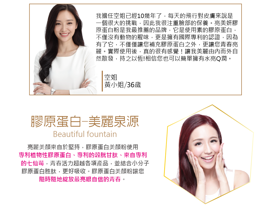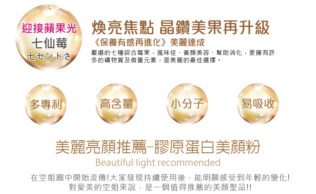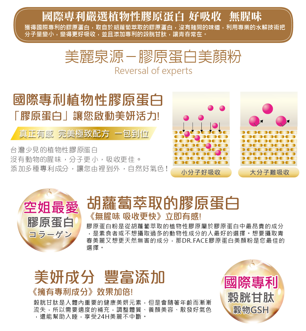 成 份:專利人蔘素食膠原蛋白、專利胡蘿蔔膠原蛋白、專利七仙莓、專利榖胱甘肽、專利大豆胜肽、余甘子萃取物、燕窩胜肽、果汁粉