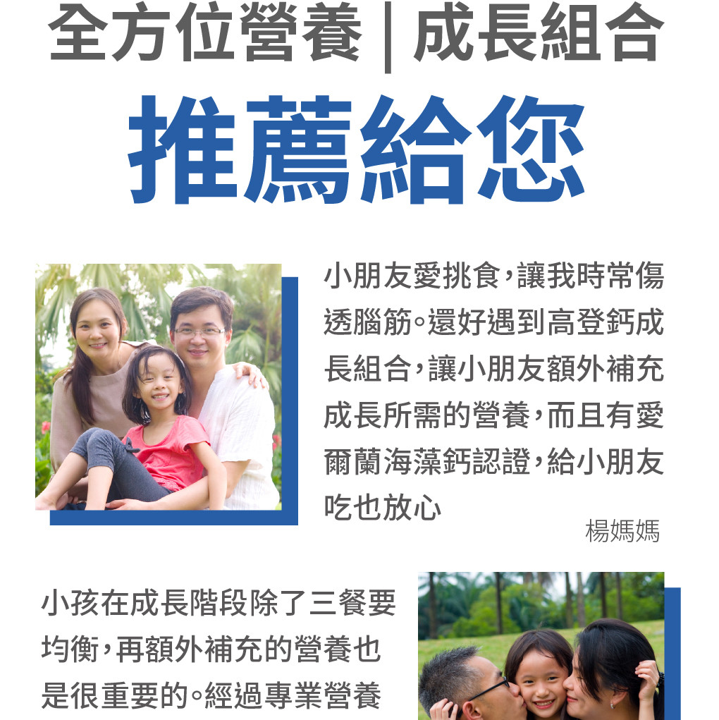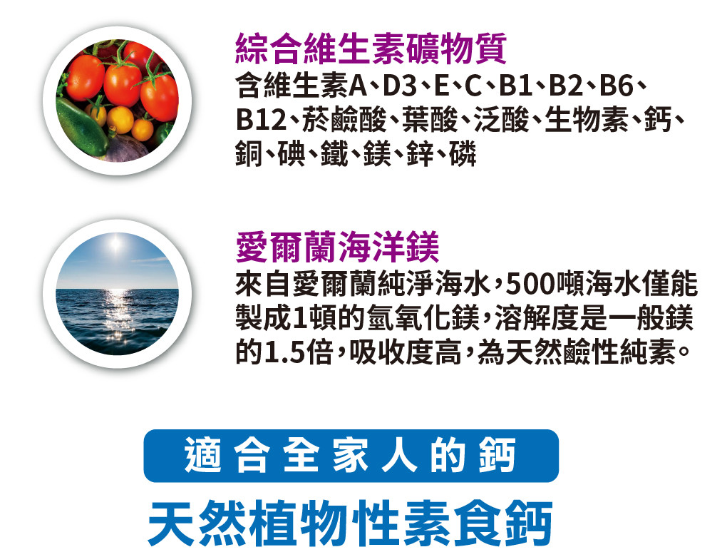 成 分:專利愛爾蘭紅藻鈣、碳酸鈣、愛爾蘭海洋鎂、綜合維生素礦物質(含維生素A、D3、E、C、B1、B2、B6、B12、菸鹼酸、葉酸、泛酸、生物素、鈣、銅、碘、鐵、鎂、鋅、磷)、酪蛋白磷酸胜肽(cpp)