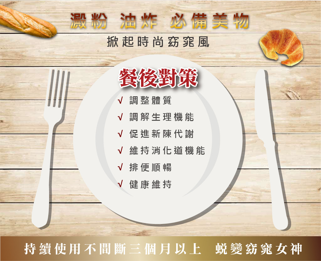 使用期間請保持正確飲食習慣,避免暴飲暴食、避免宵夜及大餐。