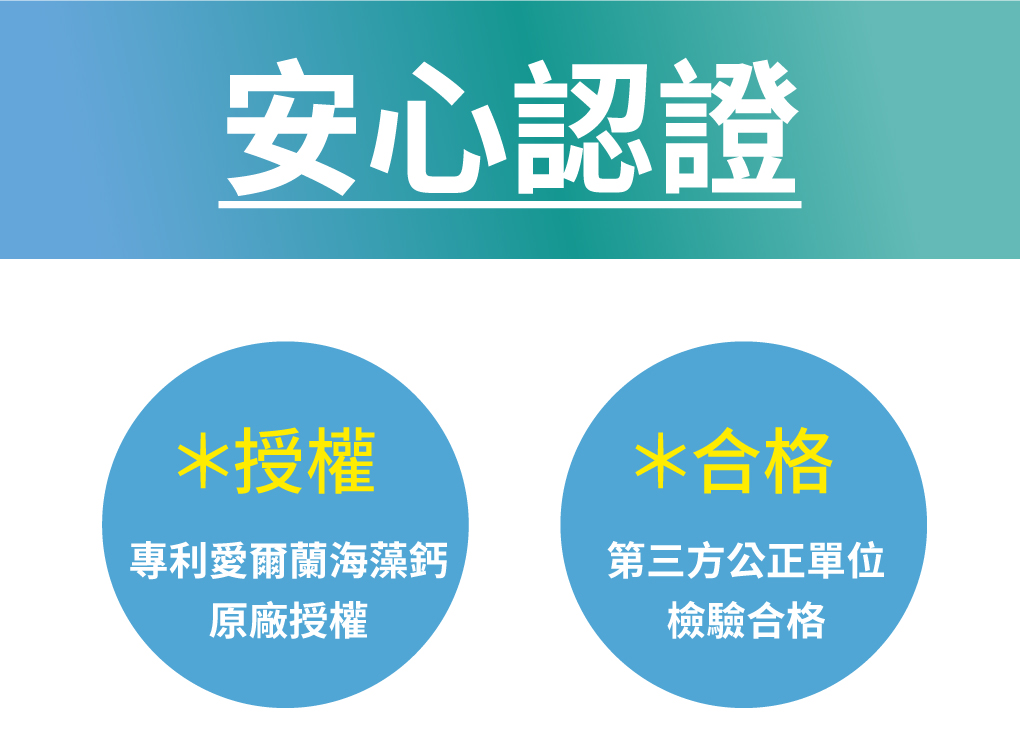 主要成分:專利愛爾蘭海藻鈣、碳酸鈣、乳糖、聚乙烯吡咯烷酮、愛爾蘭海洋鎂、硬脂酸鎂、超微奈米珍珠粉、綜合維生素礦物質(含維生素A、D3、E、C、B1、B2、B6、B12、菸鹼酸、葉酸、泛酸、生物素、鈣、銅、碘、鐵、鎂、鋅、磷)、DHA(微藻萃取)、Vita專利納豆菌發酵物K2-7