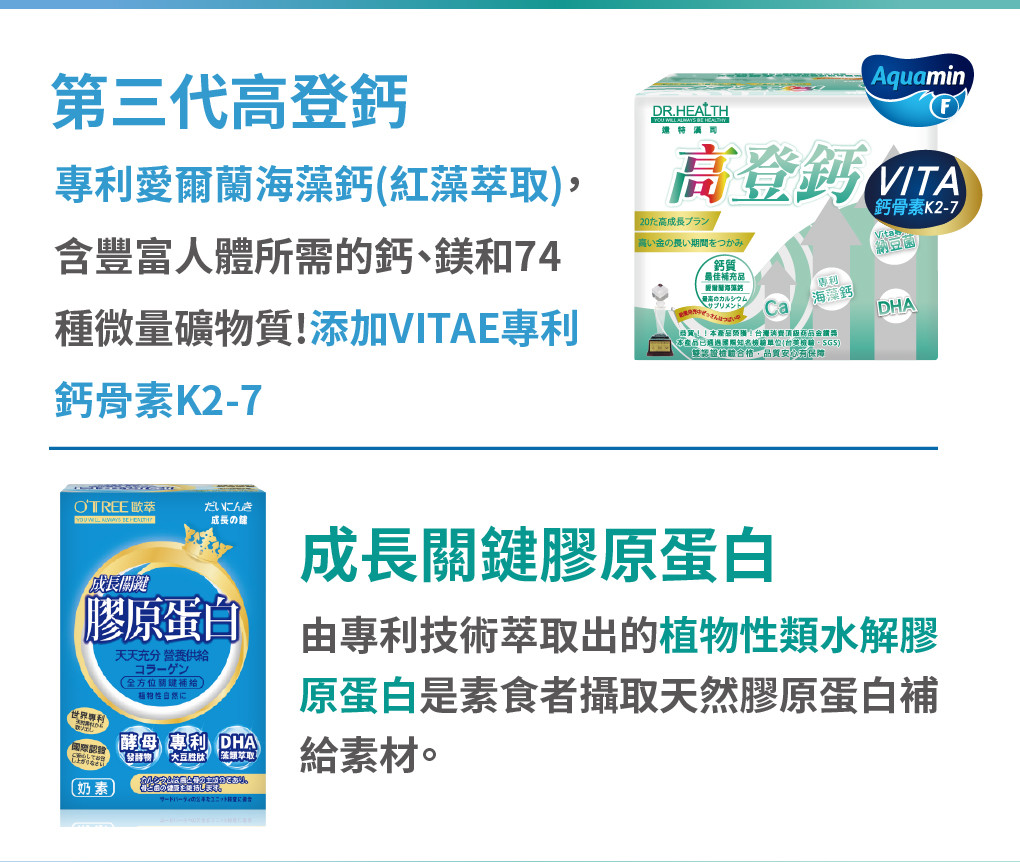 主要成分:專利愛爾蘭海藻鈣、碳酸鈣、乳糖、聚乙烯吡咯烷酮、愛爾蘭海洋鎂、硬脂酸鎂、超微奈米珍珠粉、綜合維生素礦物質(含維生素A、D3、E、C、B1、B2、B6、B12、菸鹼酸、葉酸、泛酸、生物素、鈣、銅、碘、鐵、鎂、鋅、磷)、DHA(微藻萃取)、Vita專利納豆菌發酵物K2-7