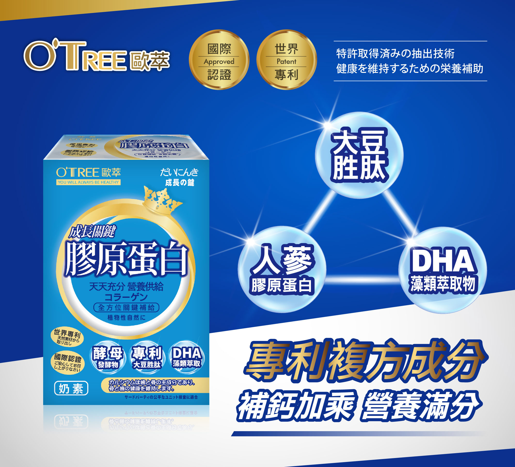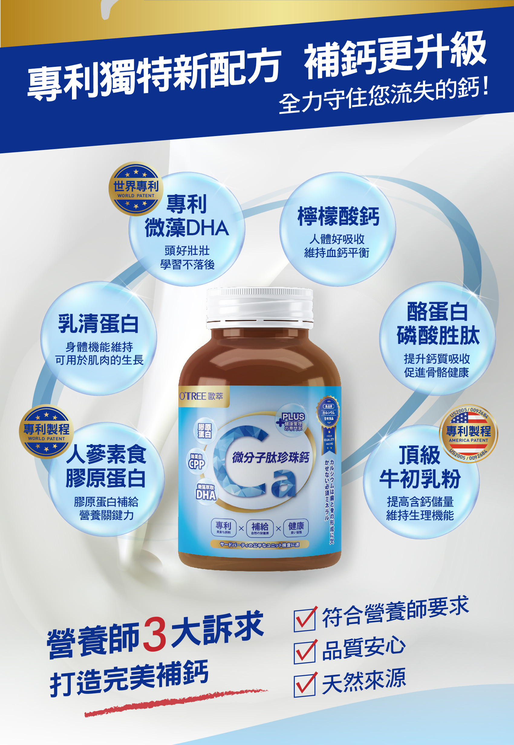主要成分:檸檬酸鈣、全脂奶粉、乳糖、葡萄糖、乳清粉、麥芽糊精、牛初乳粉(含免疫球蛋白、乳鐵蛋白)、乳清蛋白、硬脂酸鎂、愛爾蘭海洋鎂、珍珠粉、綜合維生素礦物質、酪蛋白磷酸胜肽(CPP)、專利人蔘素食膠原蛋白、DHA(微藻萃取)